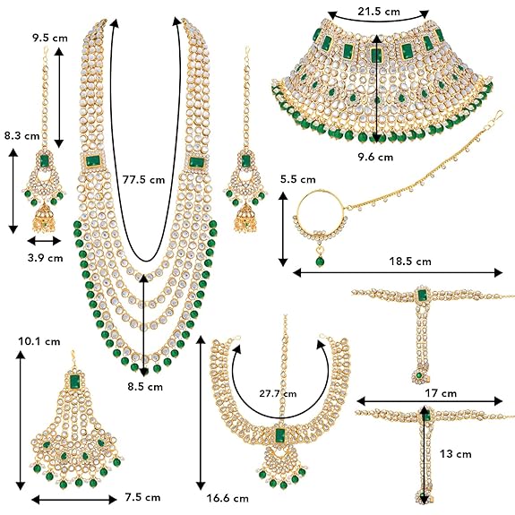 The set features intricate, ornate details and the characteristic Kundan work, which involves setting polished gemstones into gold. This creates a luxurious, regal appearance reminiscent of royal jewellery. As a complete ensemble, it provides an authentic and majestic look, making it an unforgettable gift for a bride or any woman celebrating a significant milestone.